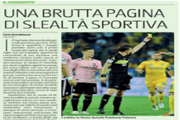 “Il Frosinone vince anche davanti alla giustizia sportiva. Il Palermo si appellerà e dunque potrebbe essere solo il primo round del match ma le poche righe con cui il giudice sportivo ha comunicato la sua decisione non sembrano lasciare molto spazio ribaltamento della decisione. Il giudice punisce in sintesi il Frosinone per avere scagliato oggetti in campo, per avere colpito con uno di questi uno degli arbitri e commina solo una multa a Majello (che aveva segnato il gel) per i palloni lanciati nel tentativo di fermare il gioco. Il Frosinone non ne esce immacolato, le due giornate squalifica del campo sporcano la sua immagine di società modello, tuttavia le aspettative dei tifosi rosanero erano ben chiare, ovvero il ribaltamento del risultato. Aspettative che in punta di di-itto avrebbero potuto trovare accoglimento solo in un caso: qualora l’arbitro La Penna avesse ammesso nel suo referto di essere state intimidito, anzi minacciato, e dunque di avere favorito il Frosinone (soprattutto nell’azione del rigore negato al Palermo) per paura di incidenti e a tutela della sua stessa incolumità. Dunque di avere proseguito la gara proforma. L’arbitro non lo ha detto, non lo ha scritto, per cui evidentemente a suo parere l’atteggiamento dei calciatori di casa e del pubblico non è stato minaccioso. La percezione del pericolo e molto personale, forse La Penna si sentiva sicuro e protetto, a noi dalla tribuna e sembrato molto condizionato dai calciatori locale. Ma questo non si può dimostrare in nessuna aula di tribunale, motivo per cui temiamo che le annunciate azioni legali del club rosanero in ambito di giustizia ordinaria rimarranno inascoltate. […]”. Questo quanto analizzato dall’edizione odierna de “Il Giornale di Sicilia”.