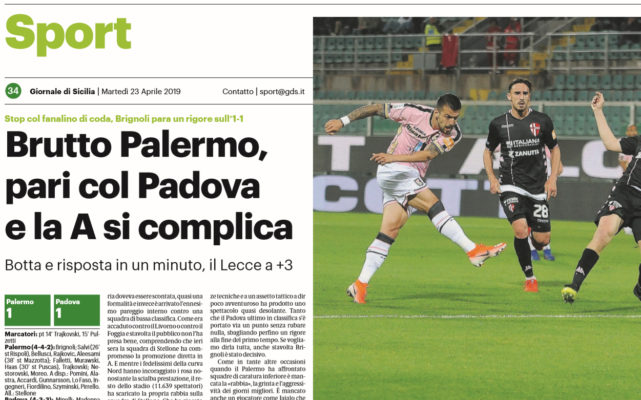 L’edizione odierna del “Giornale di Sicilia” torna sulla prestazione deludente del Palermo nella sfida interna contro il Padova ultimo in classifica. I rosanero sono usciti tra i fischi facendosi staccare di tre punti dal Lecce. Il pubblico ha compreso che la squadra di Stellone ha compromesso la promozione diretta in A. Gli ospiti hanno anche sbagliato un rigore e Brignoli si è reso decisivo. Come in tante altre occasioni il Palermo ha peccato di rabbia contro squadre di caratura inferiore. Dopo l’immediato pareggio subito da Pulzetti, il Palermo ha accusato il colpo. Successivamente, Moreo ha sprecato la palla del vantaggio al 23′. I rosanero hanno giocato con cinque attaccanti ma ha ricavato troppo poco. Il resto è stato un lungo, prevedibile, sterile monologo con attacchi tutti uguali e senza fantasia.
