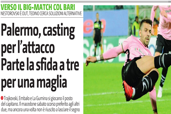 “In tre per una maglia, il casting è aperto. Nel Palermo senza Nestorovski, la corsa al posto da titolare non valida solamente per la sfida di domenica col Bari. Anzi, potrebbe diventare persino un ultimatum, vista la vicinanza col mercato di gennaio. Una finestra che ha gia i crismi dell’addio per chi finora ha deluso e che potrebbe dare qualche speranza in più a chi, finora, ha trovato meno spazio del previsto. Senza il capitano, però, cambia tutto. Cambia per Trajkovski, che potrebbe cogliere l’ultima chance per dimostrarsi utile alla causa, cosi come per La Grunina, che spera di ritrovare una maglia da titolare dopo le sole tre partenze dal primo minuto in tutto il campionato. Poche, pochissime per un ragazzo che gia in estate aveva fatto valere le proprie qualità, tanto da emergere come uno degli elementi pia positivi di tutto il ritiro in Austria. Sensazioni confermate in Coppa Italia, con la prima rete da «senior» in maglia rosanero, ma da lì in poi non ha avuto più grandi possibilità di mettersi in mostra. Quelle che invece ha avuto Embalo, in ruoli diversi e in occasioni diverse. Pure il guineano si iscrive all’elenco di chi potrebbe approfittare di questo buco in attacco, sperando però nell’arretramento di Coronado per giocare da trequartista alle spalle di uno degli altri due contendenti. Una corsa a tre che contro il Venezia è stata «vinta» da Trajkovski. Virgolette d’obbligo, visto che il macedone con la sua prestazione ha messo seriamente a repentaglio le possibilità di una riconferma a Bari. In questi giorni proverà a giocarsi le ultime carte a disposizione per essere titolare anche al «San Nicola». […]”.