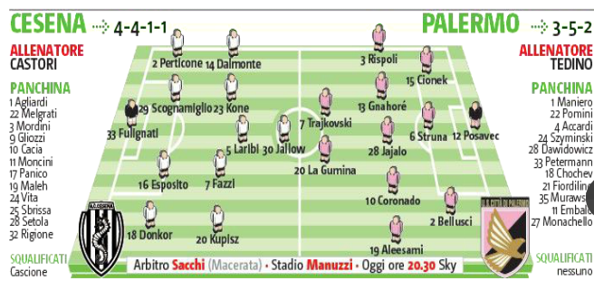 Giornale di Sicilia: Cesena-Palermo, le probabili formazioni