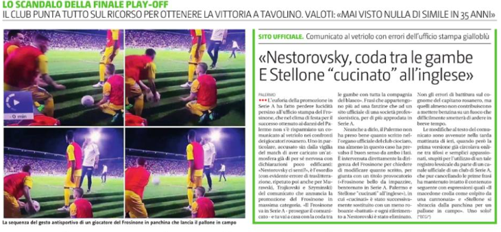 “L’euforia della promozione in A ha fatto perdere la lucidità persino all’ufficio stampa del Frosinone, che nel clima di festa per il successo ottenuto ai danni del Palermo non s’è risparmiato un comunicato al vetriolo nei confronti dei giocatori. Uno in particolare, accusato sin dalla vigilia del match di aver caricato un’atmosfera già di per sé nervosa con dichiarazioni poco edificanti: «Nestorovsky ci senti?» è l’esordio (con evidente errore di traslitterazione, ripetuto poi anche con Murawski, Trajovski e Szymisnki) del comunicato che annuncia la promozione del Frosinone in massima categoria. «Il Frosinone va in serie A – prosegue il comunicato – e tu via a casa con la coda tra le gambe con tutta la compagni del blasco». Frasi che appartengono più a una fazione che ad un sito ufficiale di una società professionistica. Neanche a dirlo, il Palermo non ha preso bene quanto scritto nell’organo ufficiale del club ciociaro, ma almeno in questo caso ha prevalso il buon senso da ambo i lati. È intervenuta direttamente la dirigenza del Frosinone per chiedere di modificare quanto scritto, per giunta con un titolo provocatorio (Frosinone bello da impazzire, bentornato in serie A. Palermo e Stellone “cucinati” all’inglese), in cui “cucinati” è stato successivamente sostituito con un roboante “battuti” e ogni riferimento a Nestorovski è stato eliminato. Le modifiche al testo del comunicato sono avvenute nella tarda mattinata di ieri, quando però la prima versione già circolava online tra tifosi e semplici appassionati, stupiti per l’utilizzo di un tale registro lessicale da parte di un canale ufficiale di un club di serie A”.