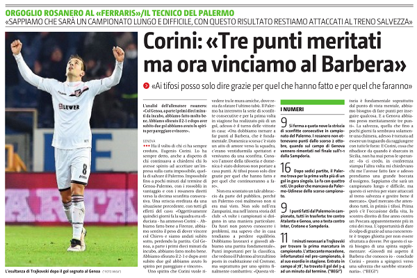 “Ha il volto di chi ci ha sempre creduto, Eugenio Corini. Lo ha sempre detto, anche a dispetto di chi continuava a chiedersi chi lo avesse spinto ad accettare un’impresa. Sulla carta impossibile, quella di salvare il Palermo. Impossibile fino a pochi minuti dal termine di Genoa-Palermo, con i rossoblù in vantaggio e con i rosanero diretti verso la decima sconfitta consecutiva. Una striscia ereditata da una situazione precedente, con tutti gli effetti del caso: «Oggettivamente quindici giorni fa la squadra era sfiduciata – ha ammesso Corini Abbiamo fatto bene a Firenze, abbiamo sentito il peso di dover vincere col Chievo e siamo andati subito sotto, perdendo la partita. Col Genoa, a parte i primi dieci minuti da incubo, abbiamo fatto molto bene. Abbiamo sfiorato il 2-1 e dopo aver subito due gol abbiamo avuto lo spirito per pareggiare e vincere». Uno spirito che Corini vuole rivedere tra le mura amiche, dove resta da sfatare l’ultimo tabü. Il Palermo ha interrotto la serie di sconfitte consecutive e per la prima volta in stagione ha realizzato piü di un gol, adesso il turno delle vittorie in casa: «Ora dobbiamo tornare a far punti al Barbera, che fondamentale. Domenica scorsa c’è stato un atto di amore verso la squadra, c’erano ventiduemila spettatori e venivamo da una sconfitta. Conosco l’amore della tifoseria e domenica stato doloroso non portare a casa punti. Ai tifosi posso solo dire grazie per quel che hanno fatto e per quel che continueranno a fare». […]”. Questo quanto riportato da “Il Giornale di Sicilia”.