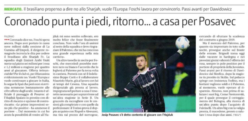 Giornale di Sicilia: “Coronado punta i piedi, ritorno… a casa per Posavec”