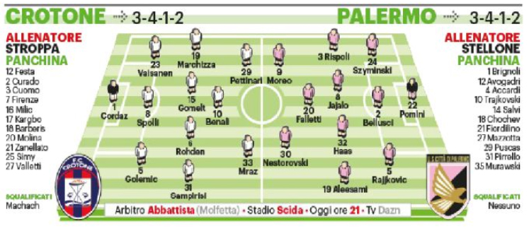In alto le probabili formazioni di Crotone-Palermo a cura del “Giornale di Sicilia”.