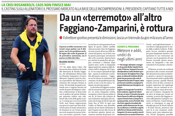 “Un addio dietro l’altro. Dal benservito dato a Roberto De Zerbi alle dimissioni di Daniele Faggiano, che all’indomani dell’ accordo tra Maurizio Zamparini e il nuovo allenatore Eugenio Corini ha chiesto al presidente del Palermo la risoluzione del contratto firmato in estate. Un triennale da quattrocentomila euro a stagione lasciato sul tavolo da parte del dirigente salentino, evidentemente in disaccordo con la politica del patron friulano per questioni relative non solamente alla scelta della guida tecnica. I «casting» per i successori di De Zerbi, anzi, hanno rappresentato una goccia in quel vaso fatto di decisione prese in totale autonomia e di situazioni in cui l’ormai prossimo ex ds rosanero ha messo la faccia a suo rischio e pericolo. Come quando, prima della partita con lo Spezia, ha rassicurato tutti sulla prosecuzione del rapporto con De Zerbi. Una presa di posizione che non ha trovato supporto nelle decisioni di Zamparini. I colloqui con Corini e Ballardini, ma anche le chiamate a De Biasi e ad altri possibili profili per il dopo De Zerbi, sono state fatte da Zamparini senza interpellare il direttore sportivo, ruolo del tutto scavalcato in una fase in cui la presenza di una figura di questo calibro sarebbe stata necessaria. Non che Faggiano sia stato tenuto all’oscuro delle decisioni del patron, ma di fatto non ha potuto partecipare attivamente alle scelte societarie. Quanto basta per mettere la parola fine alla propria avventura a Palermo dopo quattro mesi, anche se Zamparini appare piuttosto sorpreso dalla decisione dell’ ex dirigente del Trapani. «Ce ne stanno capitando di ogni tipo – questo il commento sconsolato del patron rosanero Faggiano mi ha chiesto la risoluzione del contratto, ha dei problemi pure lui, anche se non so di che natura. Vedremo nei prossimi giorni». La decisione di Faggiano sembra tale da non permettere passi indietro. Lo stesso Zamparini sembra rassegnato a dover lasciar andare il suo ds, di fronte alla richiesta di una risoluzione anticipata del contratto che lo lega al club di viale del Fante fino al 2019. In ogni caso l’addio al Palermo non dovrebbe portare ad un ritorno di fiamma in quel Trapani ancora alla ricerca di un direttore sportivo. […]”. Questo quanto spiega l’edizione odierna de “Il Giornale di Sicilia”.