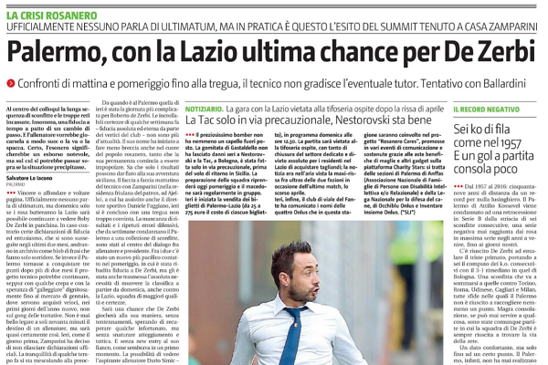 “Vincere o affondare e voltare pagina. Ufficialmente nessuno parla di ultimatum, ma domenica solo se i rosa batteranno la Lazio sarà possibile continuare a vedere Roby De Zerbi in panchina. In caso contrario certe dichiarazioni di fiducia ed entusiasmo, che si sono susseguite negli ultimi due mesi, andranno in archivio come blob di frasi che fanno solo sorridere. Se invece il Palermo tornasse a conquistare tre punti dopo più di due mesi il progetto tecnico potrebbe continuare, seppur con qualche crepa e con la speranza di “galleggiare” dignitosamente fino al mercato di gennaio, dove servono acquisti veloci, nei primi giorni dell’anno nuovo, non sul gong delle trattative. Non mai bello legare a soli novanta minuti il destino di un allenatore, ma sarà quasi certamente cosi. Ieri, come il giorno prima, Zamparini ha deciso di non rilasciare dichiarazioni ufficiali. La tranquillità di qualche tempo fa si sta mescolando alla preoccupazione di aver commesso un azzardo, affidando il nuovo corso all’ex tecnico del Foggia. Sullo sfondo non ci sono tante alternative fra gli allenatori a spasso. Ballardini — nonostante una fresca rescissione contrattuale – resta un’ipotesi plausibile per un’eventuale successione: domenica sera un dirigente rosanero ha provato a chiamare, invano, il tecnico romagnolo, ma i contatti potrebbero rinsaldarsi nei prossimi giorni. Un esonero significherebbe un esborso notevole (fra contratto per il nuovo allenatore, pagamento degli emolumenti a De Zerbi e della penale da mezzo milione di euro in caso di licenziamento), che fin qui è stato un freno alla “rivoluzione”, ma su cui si potrebbe passar sopra se la situazione precipitasse. […]. Quella di domenica sarà una chance che De Zerbi giocherà alla sua maniera, senza tentennamenti, sperando di recuperare qualche infortunato, ma senza snaturare atteggiamento e tattica. E senza new entry al suo fianco, come sembrava in un primo momento. La possibilità di vedere I’aspirante allenatore Dario Simic — croato, ex Inter e Milan, cento presenze nella propria nazionale — come nuovo componente dello staff tecnico di De Zerbi al momento sembrano pari quasi a zero. Zamparini aveva pensato a Simic come collaboratore per la fase difensiva, ma I’ipotesi non ha fatto fare salti di gioia a De Zerbi, che si fida ciecamente dei propri uomini, ovvero Davide Possanzini e Pasquale Catalano. Oltre alla squadra dei preparatori atletici. In passato Zamparini era riuscito a inserire in corsa un componente nello staff di un suo allenatore, ad esempio quando. nell’ottobre 2014, affiancò Fabio Viviani come tattico di lachini. De Zerbi non vuole “tutor” per curare parte del lavoro sul campo. Domenica o la va o la spacca”. Questo quanto riportato oggi da “Il Giornale di Sicilia”.
