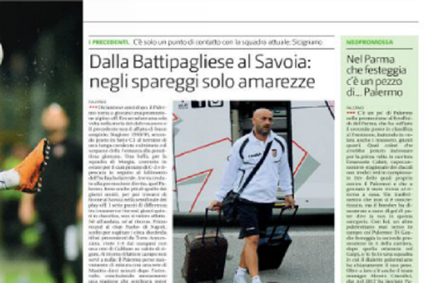 “Diciannove anni dopo, il Palermo toma a giocarsi una promozione ai play-off. Era accaduto una sola volta nella storia del club rosanero e il precedente non è affatto di buon auspicio. Stagione 1998/99, secondo posto in Serie C1 al termine di una lunga cavalcata culminata col sorpasso della Fermana alla penultima giornata. Una beffa, per la squadra di Morgia, costruita in estate per il campionato di C2 e ripescata in seguito al fallimento dell’Ischia Isolaverde. Aveva creduto alla promozione diretta, quel Palermo, forse anche più di quello dei giorni nostri, per poi trovarsi di fronte al Savoia nella semifinale dei play-off. I sette punti di differenza tra i rosanero e i torresi, giunti quinti in classifica, non si videro affatto. Ne all’andata, ne al ritorno. Primo round al «San Paolo» di Napoli, scelto per ospitare i circa diecimila tifosi provenienti da Torre Annunziata, vinto 1-0 dai campani con una rete di Califano su calcio di rigore. Al ritorno il fattore campo non servì a nulla: il Palermo perse nuovamente di misura con una rete di Masitto dieci minuti dopo l’intervallo, concludendo mestamente una stagione che sembrava poter avere tutt’altro epilogo. L’anno prima, i rosa avevano disputato il primo play-out della loro storia e anche lì, contro un’altra squadra campana, il risultato fu tutt’altro che positivo. Appena retrocesso in C-1, il Palermo chiuse campionato al quattordicesimo posto, ben distante della salvezza diretta. Troppi, nelle giornate finali, i quattro punti da recuperare al gruppetto di squadre che stazionava davanti ai rosa allenati prima da Rumignani e poi da Arcoleo. Nemmeno il successo all’ultima giornata contro la Fermana, una delle squadre che chiuse poco avanti al Palermo in quel campionato, servirono per evitare lo spareggio con la penultima in classifica. La Battipagliese, fino all’ultimo a rischio retrocessione nella corsa a due col Casarano, riuscì nel doppio confronto con i rosa a evitare il ritomo in C-2 vincendo la sfida d’andata in casa per 1-0 e resistendo ai (pochi) attacchi del Palermo nella partita di ritorno, rischiando anzi di portarsi in vantaggio. Una beffa che rappresentò il punto più basso del club di viale del Fante, retrocesso sul campo in quarta serie, salvo poi essere ripescato. Due precedenti che non rievocano affatto bei ricordi ai tifosi palermitani, ma tra il Palermo di Ferrara e quello di Zamparini è evidente che le differenze siano abissali. In verità, però, c’è un solo punto di contatto tra le tre squadre protagonista degli unici «spareggi» nella storia rosanero. Nel play-out del 1998 era solo una riserva, nel 1999, venne promosso a titolare e nel 2018 è il preparatore dei portieri, ma Vincenzo Sicignano è sempre presente quando si tratta di partite da dentro o fuori con la maglia rosanero. Anche in quelle che ufficialmente non sono state vere e proprie finali per la promozione o la salvezza, ma quasi: lo scontro diretto per la A nel 2003 a Lecce l’ha giocato da protagonista (e anche lì, non andò bene), mentre era gia «promosso» nello staff tecnico della prima squadra quando i rosanero batterono ii Verona all’ultima giomata per guadagnarsi la permanenza in massima serie”.