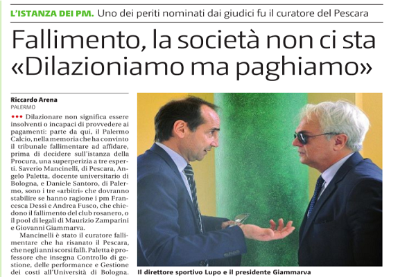 “Dilazionare non significa essere insolventi o incapaci di provvedere ai pagamenti: parte da qui, il Palermo Calcio, nella memoria che ha convinto il tribunale fallimentare ad affidare, prima di decidere sull’istanza della Procura, una superperizia a tre esperti. Saverio Mancinelli, di Pescara, Angelo Palette, docente universitario di Bologna, e Daniele Santoro, di Palermo, sono i tre «arbitri» che dovranno stabilire se hanno ragione i pm Francesca Dessi e Andrea Fusco, che chiedono il fallimento del club rosanero, o il pool di legali di Maurizio Zamparinl e Giovanni Giammarva. Mancinelli è stato il curatore fallimentare che ha risanato il Pescara, che negli anni scorsi fallì. Palette e professore che Insegna Controllo di gestione, delle performance e Gestione del costi all’Università di Bologna. Santoro e revisore dei conti e commercialista a Palermo. Toccherà a loro analizzare la consulenza di Alessandro Colaci, che ha lavorato per conto del pm, e il lavoro degli esperti Nicola Ribolla e Corrado Ferriani, incaricati della societi di viale del Fame. Due mesi circa di tempo, poi si tornerà a discutere e il collegio presieduto da Giovanni D’Antoni, composto dal giudice delegato Giuseppe Sidoti e dal giudice a latere Raffaella Vacca «andra in decisione» cosa che comporterà altri giorni, non quantificabili, di attesa per la sentenza (in caso di fallimento) o per l’ordinanza se l’Istanza sarà rigettata. Il Palermo si difende sostenendo di avere scelto le dilazloni per «ottimizzare le risorse finanziarie e analizza l’elenco dei debiti verso i procuratori del calciatori, riportato al 31 ottobre: 15.831.298,11. L’aggiomamento al 6 dicembre porta a rivedere le cifre di circa mezzo milione in meno. Un rapporto dinamico, con gli agenti, percheé i valori dei calciatori cambiano: e a questo proposito la cifra indicate da Colaci (19,8 milioni la stima del patrimonio-giocatori) viene elevate a 43 milioni. Il fato che i procuratori accettino la rimodulazione,  scrive il collegio difensivo del Palermo – testimonia ulteriormente la solidità economica della società, che gode di credibilità e affidamento. I principali creditori, Pencil Hill Ltd, Pdp, Gilino, Corvino Management, Football Now, Stefano Salvini, Marcelo Simonian, Al Geto Doo, Gr Sport Agency, hanno accettato di spostare i pagamenti all’esercizio 2018-2019 e per la parte che li riguarda, le previsioni di debiti del Palermo passano da 3.891.513,34 a 77.416,66 euro. Ci sono poi contenziosi che portano a dire che, più che crediti, si possa parlare di aspettative da parte degli agenti. Il Palermo ritiene di avere le proprie buone ragioni anche sull’affare del marchio, ceduto alla Mepal, a sua volta acquisita dalla Alyssa: valeva più di 40 milioni, al 30 giugno 2014, e questo dimostra «la complessiva inattendibilità della consulenza Colaci e la sua inidoneità a fomire la base per una richiesta di fallimento». […]”