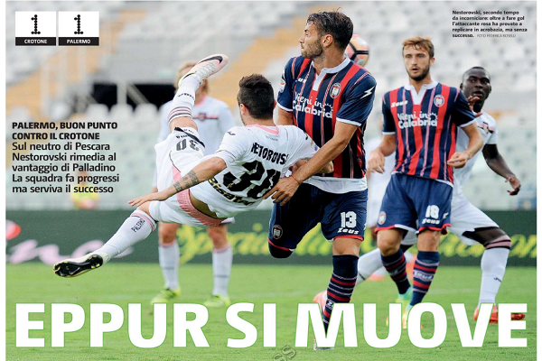“Eppure si muove”. E’ questo quanto titola oggi “Il Giornale di Sicilia” in merito al match pareggiato ieri dal Palermo contro il Crotone. Nestorovski si sblocca e risponde al vantaggio siglato da Trotta. Il gioco dei rosa fa progressi, ma a detta del quotidiano, ieri al neutro di Pescara serviva il successo.