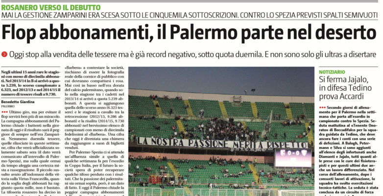 Giornale di Sicilia: “Flop abbonamenti, il Palermo parte nel deserto. Oggi stop alla vendita delle tessere ma è già record negativo, sotto quota duemila”