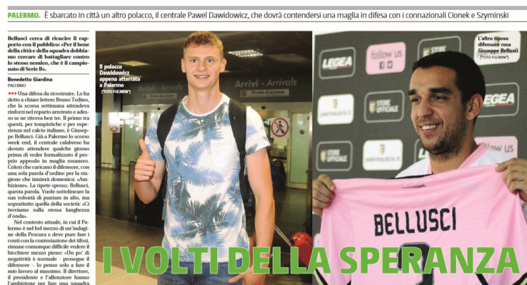 “Una difesa da ricostruire. Lo ha detto a chiare lettere Bruno Tedino, che la scorsa settimana attendeva rinforzi nel reparto arretrato e adesso se ne ritrova ben tre. Il primo tra questi, per tempistiche e per esperienza nel calcio italiano, è Giuseppe Bellusci. Già a Palermo lo scorso week end, il centrale calabrese ha dovuto attendere qualche giorno prima di veder formalizzato il proprio approdo in maglia rosanero. Colori che caricano il difensore, con una sola parola d’ordine per la stagione che inizierà domenica: «Ambizione». La ripete spesso, Bellusci, questa parola. Vuole sottolineare la sua volontà di puntare in alto, ma soprattutto quella della società: «Ci troviamo sulla stessa lunghezza d’onda». Nel contesto attuale, in cui il Palermo è nel bel mezzo di un’indagine della Procura e deve pure fare i conti con la contestazione dei tifosi, rimane comunque difficile vedere il bicchiere mezzo pieno: «Un po’ di negatività è normale – prosegue il difensore -. Io penso solo a fare il mio lavoro al massimo. Il direttore, il presidente e l’allenatore hanno l’ambizione per fare una squadra altamente competitiva. Inutile nasconderci, la promozione è l’obiettivo». Proclami immediati, dunque, perché il blasone del Palermo e la forza della squadra lo impongono. Così come lo impone un obbligo su tutti, quello di ricucire un rapporto con la tifoseria giunto ai minimi storici: «Questo dipende solo da noi. Capisco la protesta, ma per il bene della città e della squadra dobbiamo cercare di battagliare contro lo stesso nemico, che è il campionato di Serie B». Un torneo lungo e complicato: «Il livello delle squadre si è alzato – conclude Bellusci – ma noi possiamo dire la nostra per vincere». Obiettivo chiaro per tutti, dunque, anche per chi ancora non ha messo piede al campo di allenamento. Perché per rinforzare il reparto difensivo è arrivato l’ultimo tassello, l’ennesimo giovane proveniente dalla Polonia. Dopo Murawski e Szyminski (ufficializzato ieri, presentato oggi pomeriggio) è il turno di Pawel Dawidowicz, ventiduenne proveniente dalla squadra B del Benfica e pronto a misurarsi col calcio italiano: «Il Palermo è un grande club e vogliamo tornare subito in A», sono state le prime parole di Dawidowicz una volta atterrato a Punta Raisi verso le 13.45 di ieri. «Il primo obiettivo è quello di ritornare in Serie A – ribadisce il centrale polacco -parlerò ovviamente col tecnico e sarà lui a darmi l’ok per giocare sin da subito o meno. Meglio che sia lui a esprimersi anche sul mio ruolo». Dawidowicz, infatti, può giocare anche da riferimento in mediana davanti alla difesa, anche se il suo ruolo è quello di centrale nel reparto arretrato. In ogni caso, può dividere il posto con i vari Cionek, Szyminski e Murawski, i connazionali che ritrova adesso in Sicilia: «Non vedo l’ora di incontrarli – conclude Dawidowicz – per me è un bene trovare altri polacchi con cui parlare, però io sono qui per imparare l’italiano. E giocare a calcio, ovviamente”.