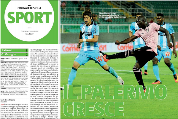 “E’ andata bene ma guai ad illudersi. Bene Embalo, Rajkovic è da rivedere. Vitiello centrale un sorpresa, Goldaniga sicuro. Tutto il resto è da inventare e sarebbe un disastro ritenere che questo risultato con una squadra titolata possa avere risolto i problemi dei rosanero. Il gruppo sta lavorando bene, ma questo Palermo non può affrontare il campionato senza rinforzi collaudati a centrocampo ed in attacco. Mancano fantasia e potenza e restano solo poco più di venti giorni per rimediare. Il primi tempo è stato noioso, la ripresa di tutt’altra pasta. Il gol di Embalo ha restituito sprazzi di felicità perduta. Dubbio, infine, il rigore assegnato da Gavillucci all’Olympique Marsiglia: Posavec sembra essere entrato deciso sulla palla”. Questo quanto si legge sull’odierna edizione de “Il Giornale di Sicilia” in merito all’amichevole di ieri sera tra Palermo e OM.