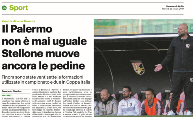 L’edizione odierna de “Il Giornale di Sicilia” ha deciso di riportare le ultime notizie che riguardano le possibili scelte di formazione di Stellone in vista del match contro il Cosenza. Ecco un estratto dell’articolo: Stellone non si smentisce mai. Non ha mai schierato la stessa formazione per due gare consecutive in campionato e non ha mai riutilizzato uno degli schieramenti usati da Tedino, altro tecnico che non disprezzava mischiare le carte. Cosa che accadrà sicuramente a Cosenza, dove le assenze di Chochev, Falletti e Salvi lasciano presagire la possibilità di vedere in campo una nuova formazione mai vista prima. Un turnover che però turnover non è, perché Stellone lo ha spiegato sin da subito: considera tutti alla pari e tutti avranno le stesse possibilità di scendere in campo. Ma la specialità della casa non è tanto il presentarsi sempre con una formazione diversa rispetto alla giornata precedente. Fatta eccezione per le partite contro Crotone e Benevento del girone d’andata, ha sempre presentato uno schieramento inedito. L’unica occasione in cui ha ripetuto uno spartito già utilizzato è stato all’inizio del suo secondo ciclo nella panchina rosanero.