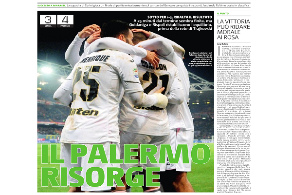 “Incredibile a Marassi. I miracoli esistono. Stavolta lo fa il Palermo. Al 68′ era sotto di due gol, probabilmente aveva salutato la Serie A. Venticinque minuti dopo era ancora vivo. Pazzesco, meraviglie del calcio. A Palermo le avevamo dimenticate. Vince la seconda partita della stagione, su uno dei campi più difficili della A (il Genoa di recente le aveva suonate alla Juventus), non c’era mai riuscito a Marassi nella massima serie il Palermo. Vince dopo nove sconfitte di fila e adesso pub sperare nuovamente. L’Empoli era scappato a +8 sabato, ora il distacco tornato lo stesso delle ultime settimane. Il campionato è lungo, questa vittoria può essere l’inizio di una nuova stagione. Non porta solo tre punti, dà una botta al morale. Quello che serviva prima di un’altra partita fondamentale, quella con il Pescara di giovedì prossimo. Le lacrime di Goldaniga (suo il gol che ha riaperto le speranze) sono la fotografia di quello che significa questa vitto- ria. É il primo successo di Corini che ha avuto coraggio a cambiare quando ormai sembrava persa, ma anche il riscatto di gente come Goldaniga appunto e Trajkovski. Era al debutto stagionale il macedone, gli infortuni l’hanno tartassato. Ricominciare così il massimo. Ora il Palermo può davvero crederci. Nel club dei quattro c’é ancora, giovedì se batte il Pescara può eliminare una diretta concorrente. […]”. Questo quanto si legge su “Il Giornale di Sicilia”.