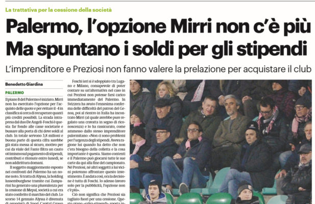 L’edizione odierna del “Giornale di Sicilia” evidenzia come il piano B del Palermo sia ormai iniziato. Dopo la mancata concretizzazione dell’opzione di acquisto affidata a Mirri, si pensa a recuperare più crediti possibili per sopperire al pagamento degli stipendi. L’obiettivo del duo De Angeli-Foschi sarebbe quello di bussare alla porta di chi deve dare soldi al club. Servono 3,8 milioni e buona parte di questa cifra è ormai al sicuro. In viale del Fante filtra così un cauto ottimismo sul pagamento degli stipendi che potrebbe anche avvenire nella giornata di domani.