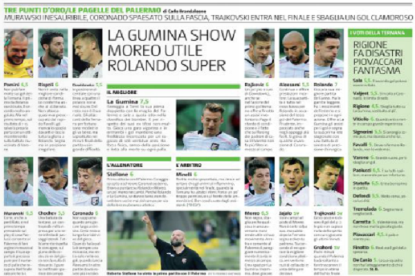 L’edizione odierna de “Il Giornale di Sicilia” ha stilato le pagelle di Ternana-Palermo. Promosso a pieni voti il bomber di giornata, Nino La Gumina. Per lui voto 7,5 e la valutazione seguente: “Gioca una gara vigorosa e in entrambi i gol mantiene una freddezza inconsueta per un ragazzo di soli 22 anni. Ha forza fisica, senso di posizione e lotta alla morte su ogni palla”. Voto alto anche per Rolando, in gol con la sua prima rete in maglia rosanero. Per il terzino voto 7: “Gioca la sua miglior partita dell’anno – si legge – Offre a La Gumina gli assiste e segna la sua prima rete in maglia rosanero con una battuta di sinistro di una precisione chirurgica”. Buona valutazione anche per Moreo che si rende utile e prende un 6,5. Di seguito le restanti valutazioni: