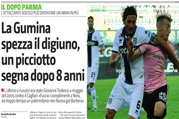 “Un digiuno lungo otto anni, ma al “Barbera” può tomare ad esultare grazie ad un suo picciotto. Tanto è passato dall’ultimo gol di un palermitano in campionato, prima che Nino La Gumina spezzasse l’incantesimo e trovasse la via della rate col Parma. L’ultimo palermitano a segnare in casa con la maglia rosanero era stato Giovanni Tedesco: 3 maggio 2009, cinquina rifilata al Cagliari e festa anche per il centrocampista, alla sua ultima marcatura con la squadra della sua città. Da li in poi nessun altro palermitano fino alla domenica che ha sbloccato il giovane centravanti classe ’96. A secco in campionato, un solo gol in Coppa Italia (a Torino contro it Cagliari) e la pressione di tutta una città che non vedeva l’ora di esultare per un suo figlio. Quello che adesso punta ad allungare la striscia realizzativa, dopo la perla spedita alle spalle di Frattali nell’ultimo match stagionale. Un passo alla volta, seguendo i consigli di chi lo ha preceduto e sa bene cosa significhi esultare davanti alla propria gente.[…]”.
