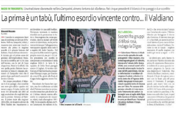 “L’esordio in campionato fuori casa si conferma un tabu per il Palermo. Nell’era Zamparini, infatti, i rosanero non sono mai riusciti a vincere alla prima in stagione quando si è giocato lontano dal Barbera. Una tradizione sfavorevole iniziata gia nel primo anno di gestione dell’imprenditore friulano con la sconfitta per 4-2 in casa • dell’Ancona con le reti di Ganz, doppietta Maini e Graffiedi. […]. Si tratta, inoltre, del terzo 0-0 all’esordio dal 2003 ad oggi, un risultato che negli altri due casi ha portato fortuna al Palermo. Il primo risale alla stagione 2003-2004, coi rosanero allenati da Silvio Baldini che impattarono a reti inviolate in casa dell’Avellino. Un’annata terminata in maniera trionfale con la promozione in Serie A. […]. Precedenti che fanno ben sperare, ma che confermano un tabu che il Palermo non riesce a spezzare e che ormai dura più di trent’anni. L’ultima vittoria esterna all’esordio in campionato dei rosanero, infatti, risale alla stagione 1987-1988. Era la squadra allenata da Pino Caramanno che militava in Serie C2 e che aveva iniziato l’annata con l’amichevole contro l’Atletico Mineiro per festeggiare il ritorno alla Favorita. Il Palermo vinse per 2-1 a San Rufo, un paese in provincia di Salerno di poco meno di duemila anime, contro il Valdiano. De-cisive le reti di Casale – migliore marcatore di quella stagione con tredici gol messi a segno – e D’Este. […]”.