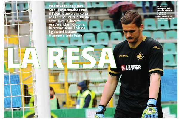 “La Resa” titola l’edizione odierna de “Il Giornale di Sicilia” in apertura della pagina sportiva. Il quotidiano poi scrive: “Ko anche col Cagliari. Solo la matematica tiene ancora a galla il Palermo. Ma l’Empoli resta distante sette punti e davanti ora c’è anche il Crotone. La retrocessione è vicina, i giocatori lasciano il campo a testa bassa”