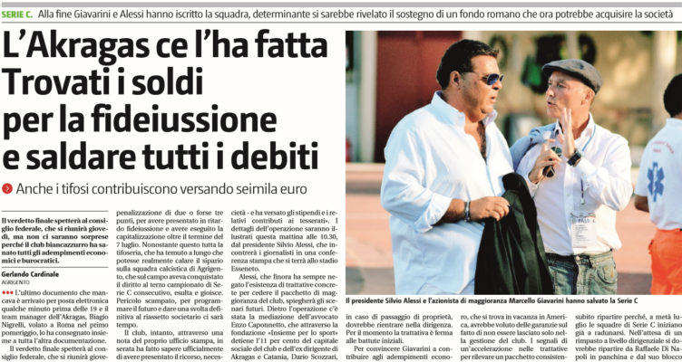Giornale di Sicilia: “L’Akragas ce l’ha fatta. Trovati i soldi per la fideiussione e saldare tutti i debiti”