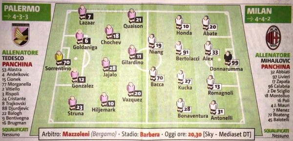 Giornale di Sicilia: le probabili formazioni di Palermo-Milan