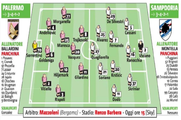 Giornale di Sicilia: le probabili formazioni di Palermo-Sampdoria