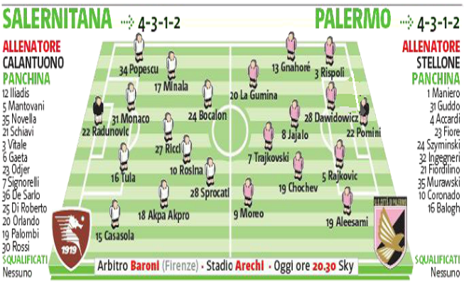 Giornale di Sicilia: le probabili formazioni di Salernitana-Palermo