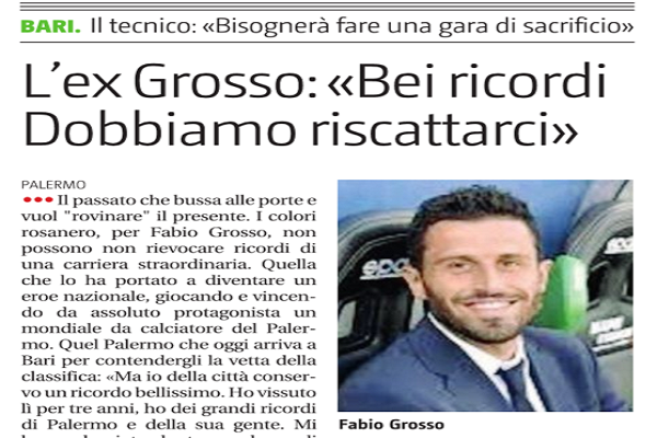 “Il passato che bussa alle porte e vuol “rovinare” il presente. I colori rosanero, per Fabio Grosso, non possono non rievocare ricordi di una carriera straordinaria. Quella che lo ha portato a diventare un eroe nazionale, giocando e vincendo da assoluto protagonista un mondiale da calciatore del Palermo. Quel Palermo che oggi arriva a Bari per contendergli la vetta della classifica: «Ma io della città conservo un ricordo bellissimo. Ho vissuto li per tre anni, ho dei grandi ricordi di Palermo e della sua gente. Mi hanno lasciato dentro qualcosa di bello, ho creato delle relazioni importanti in quell’ambiente. Ricordi del genere sono sempre piacevoli, è una grande emozione». E in quel Palermo, Grosso, condivideva il campo con Brienza, che oggi scalpita per una maglia da titolare con i pugliesi: «Franco e un giocatore determinante per questa squadra, al di la del fatto che sia titolare o entri a gara in corso. Devo capire se inserirlo subito o meno, ma le sue qualiyà le conosciamo tutti, non possono essere messe in discussione». […]”