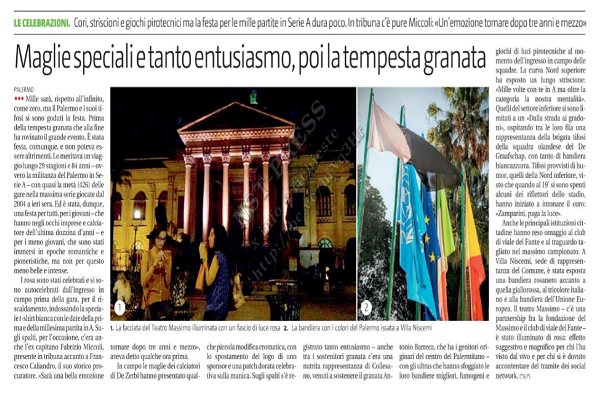 “Mille sarà, rispetto all’infinito, come zero, ma il Palermo e i suoi tifosi si sono goduti la festa. Prima della tempesta granata che alla fine ha rovinato il grande evento. É stata festa, comunque, e non poteva essere altrimenti, meritava un viaggio lungo 29 stagioni e 84 anni – ovvero la militanza del Palermo in Serie A – con quasi la metå (426) delle gare nella massima serie giocate dal 2004 a ieri sera. Ed e stata. dunque, una festa per tutti, per i giovani —che hanno negli occhi imprese e calciatore dell’ultima doz.7,ina d’anni — e per i meno giovani. che sono stati immersi in epoche romantiche e pioneristiche, ma non per questo meno belle e intense. I rosa sono stati celebrati e si sono autocelebrati dall’ingresso in campo prima della gara, per il riscaldamento, indossando la speciale t-shirt bianca con le date della prima e della millesima partita in A. Sugli spalti, per l’occasione, c’era anche l’ex capitano Fabrizio Miccoli, presente in tribuna accanto a Francesco Caliandro, il suo storico procuratore. Sarå una bella emozione tornare dopo tre anni e mezzo», aveva detto qualche ora prima. In campo le maglie dei calciatori di De Zerbi hanno presentato qualche piccola modifica cromatica, con lo spostamento del logo di uno sponsor e una patch dorata celebrativa sulla manica. Sugli spalti s’é registrato tanto entusiasmo — anche tra i sostenitori granata c’era una nutrita rappresentanza di Collesano, venuti a sostenere il granata, Antonio Barreca, che ha i genitori originari del centro del Palermitano — con gli ultras che hanno sfoggiato le loro bandiere migliori, furnogeni e giochi di luci pirotecniche al momento dell’ingresso in campo delle squadre. La curva Nord superiore ha esposto un lungo striscione: «Mille volte con te in A ma oltre la categoria la nostra mentalità». Quelli del settore inferiore si sono limitati a un «Dalla strada ai gradoni», ospitando tra le loro fila una rappresentanza della brigata tifosi della squadra olandese del De Graafschap, con tanto di bandiera biancazzurra. Tifosi provvisti di humor, quelli della Nord inferiore, visto che quando al 19′ si sono spenti alcuni dei riflettori dello stadio, hanno iniziato a intonare il coro: «Zamparini, paga la luce». Anche le principali istituzioni cittadine hanno reso omaggio al club di viale del Fante e al traguardo tagliato nel massimo campionato. A Villa Niscemi, sede di rappresentanza del Comune, stata esposta una bandiera rosanero accanto a quella giallorossa, al tricolore italiano e alla bandiera dell’Unione Europea. Il teatro Massimo — c’è una partnership fra la fondazione del Massimo e il club di viale del Fante – è stato illuminato di rosa: effetto suggestivo e magnifico per chi I’ha visto dal vivo e per chi si dovuto accontentare del tramite dei social network”. Questo quanto riportato da “Il Giornale di Sicilia”.