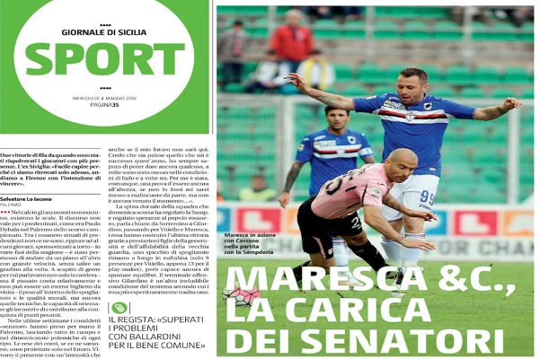 “Nel calcio gli ascensori non esistono, esistono le scale. Il discorso non vale per i predestinati, come era Paulo Dybala nel Palermo dello scorso campionato. Tra i rosanero attuali di predestinati non ce ne sono, eppure ad alcuni giovani, sponsorizzati a torto – in varie fasi della stagione – è stato permesso di andare da un piano all’altro con grande velocità, senza salire un gradino alla volta. A scapito di gente per cui parlavano non solo la carriera ma il passato conta relativamente e non può essere un eterno biglietto da visita – il peso all’interno dello spogliatoio e le qualità morali, ma ancora quelle tecniche, le capacità di orienta re gli incontri e di contribuire alla conquista di punti pesanti. Nelle ultime settimane i cosiddetti senatori hanno preso per mano il Palermo, lasciando tutto in campo e nel dimenticatoio polemiche di ogni tipo, le rese dei conti, se ce ne saranno, sono proiettate solo nel futuro. Vivono il presente con un’intensità che certi baby non hanno garantito, con la serenità di chi e pronto a dare tutto, con la lucidità che è concessa solo a chi ha nei garretti centinaia di gare a certi livelli. Enzo Maresca e un esempio fulgido dei calciatori accantonati lungo la strada. Messa da parte a più riprese, finito anche fuori rosa, ma ancora qui a lottare per la salvezza rosanero. Messo spesso in un cantuccio. Forse non esclusivamente per motivi fisici o tattici, ma più probabilmente per ragioni legate alla dialettica, al temperamento, alla presunta appartenenza a un «clan» (quello dei fedelissimi di Iachini), ai capelli bianchi che, nel rispetto dei ruoli, esigono rispetto. Parlare di rivalsa sarebbe semplice. Lui non lo fa. Chi lo voleva pensionare anticipatamente, però, ha avuto tono. «Trentasei anni none l’età per prendersi rivincite – osserva l’ex di love e Siviglia – e ora più che pensare a me sono concentrato sulla situazione del Palermo, anche se il mio futuro non sarà qui. Credo che sia palese quello che mi è successo quest’anno, ho sempre saputo di poter dare ancora qualcosa, a volte sono stato messo nelle condizioni di farlo e a volte no. Per me è stata, comunque, una prova d’essere ancora all’altezza, se non lo fossi mi sarei messo a malincuore da parte, ma non è ancora venuto il momento…». La spina dorsale della squadra che domenica scorsa ha regolato la Samp, e regalato speranze al popolo rosanero, parla chiaro: da Sorrentino a Gllardino, passando per Vitiello e Maresca, i rosa hanno costruito l’ultima vittoria grazie a prestazioni figlie della generosità e dell’affidabilità della vecchia guardia, uno spicchio di spogliatoio rimasto a lungo in naftalina, però capace ancora di spostare equilibri. Il terminale offensivo Gilardino è un’altra ineludibile condizione del teorema secondo cui i rosa più esperti raramente tradiscono: la continuità delle ultime prestazioni del campione del mondo, lo score (nove reti) che ne fa il rosanero più prolifico, la grinta vera davanti ai ruggiti dei giovani leoni alle sue spalle trasformatisi in miagolii, sono sicurezze monolitiche. «Ma Alberto – considera il numero 25 rosanero – non mi ha stupito, né penso abbia sorpreso nessuno. Anche in condizioni difficili, non giocando tutte le volte che avrebbe potuto, e a un passo dalla doppia cifra in campionato. Quando si e buoni come Alberto, e lo dico a ragion veduta perché lo conosco da almeno quindici anni, si dà sempre un apporto importante al gruppo, in settimana e anche quando si gioca meno. Poi in campo ha fatto vedere ancora di cosa «e capace». Il presente e l’immediato futuro stanno dando una chance speciale a chi è rimasto ai margini, ma ha ancora qualcosa da dire. […]”. Questo quanto si legge sull’edizione odierna de “Il Giornale di Sicilia”.