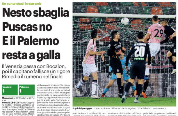 “Alla fine si può dire dire che al Palermo è andata bene. Il Palermo pareggia a Venezia grazie a un gol a sei minuti dalla fine di Puscas, dopo avere sbagliato poco prima un rigore con Nestorovski. Avere schierato tre attaccanti non è servito per mettere all’angolo una squadra spaventata e ai margini della zona retrocessione. Il Venezia ha fatto poco e in un paio di occasioni è stato salvato dal proprio portiere ma dal Palermo ci si aspettava molto di più. Per buona parte della gara i rosa hanno girato la palla senza idee, nel primo tempo hanno calciato solo una volta contro la porta del Venezia e solo nella ripresa è riuscita a rendersi pericolosa sfruttando qualche iniziativa di Falletti e la forza fisica di Puscas, che al 39′ ha anticipato di testa i difensori di Cosmi sul corner da sinistra calciato da Falletti. Dopo tre sconfitte di fila e un cambio di allenatore, il Venezia non poteva giocare in modo diverso. Cinque difensori, spesso anche undici giocatori dietro la linea della palla e tanta paura in corpo. Nessuno dei rosa ha provato a rischiare, nessuno ha preso l’iniziativa e lo sterile palleggio in mezzo al campo s’è sempre fermato sulla linea della trequarti. Il Venezia ha balbettato, ha avuto paura, poi considerato che il Palermo non era poi così brutto come veniva descritto ha preso coraggio ed ha iniziato a ripartire pericolosamente, sfruttando il movimento di Citro, che ha spesso sorpreso la difesa rosanero. Al 39′ arriva la frittata. Il gol del Venezia nato da un’invenzione di Citro che da destra ha cambiato gioco lunghissimo per Bruscagin, sul lungo traversone Rispoli non è stato perfetto a chiudere la diagonale e l’esterno del Venezia ha rimesso al centro al volo, Bocalon ha anticipato i difensori centrali del Palermo ed ha segnato da due passi. La rete ha svegliato il Palermo che nella ripresa ha rischiato tutto giocando con quattro attaccanti. La pressione dei rosa è diventata col tempo un assalto e il Venezia ben presto ha badato esclusivamente ad allontanare la palla dalla propria area. Tuttavia ogni sforzo dei rosa s’è perso nel nulla, Falletti ha portato un po’ di movimento tra le linee del Venezia ma mai Vicario era stato impegnato, fin quando sul cross da sinistra di Jajalo Bruscagin ha trattenuto Nestorovski e Ros ha indicato senza esitazioni in dischetto. Bravo Vicario ed ipnotizzare il capitano rosanero. Qui il Palermo è bravo a non smontarsi, ha continuato a spingere sfiorando il gol al 32′ con una battuta di Jajalo parata sotto l’incrocio da Vicario fin quando al 39′ Puscas con forza e tempismo ha scaricato la palla in rete di testa. Sconfitta evitata, ma la speranza di tornare domenica in testa battendo il Carpi al Barbera è sfumata in questa umida serata del «Penzo»”.