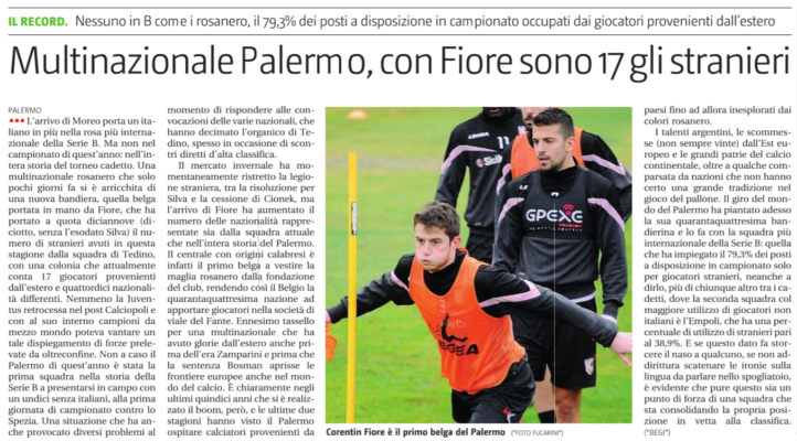 L’arrivo di Moreo porta un italiano in più nella rosa più internazionale della Serie B. Ma non nel campionato di quest’anno: nell’intera storia del campionato cadetto. Una multinazionale che qualche giorno fa si è arricchita del belga Fiore, che ha portato a 19 (18 senza Silva) il numero di stranieri avuti in questa stagione da Tedino, con una colonia che conta 17 giocatori provenienti dall’estero e 14 nazioni diverse. Nemmeno la Juventus retrocessa dal caso Calciopoli poteva vantare un tale dispiegamento proveniente da oltreoceano. Non a caso il Palermo di quest’anno è stata la prima squadra della storia della serie B a presentarsi in campo con undici stranieri, alla prima giornata di campionato contro lo Spezia. Una situazione che ha portato a diversi problemi al momento di rispondere alle convocazioni delle varie nazionali, che hanno decimato l’organico di Tedino. Il mercato invernale ha ristretto il numero di stranieri vista la rescissione di Silva e la partenza di Cionek, ma l’arrivo di Fiore ha aumentato il numero delle nazionalità rappresentate nel Palermo. Il centrale è il primo belga a vestire la maglia rosanero. Ennesimo tassello per la multinazionale che ha avuto anche glorie prima dell’arrivo di Zamparini”.
