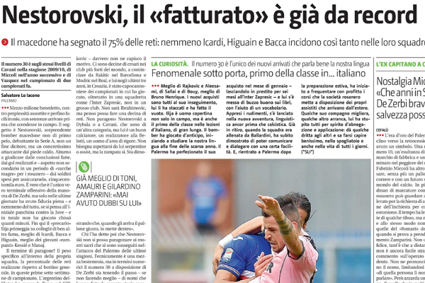“Mezzo milione benedetto, contro perplessità assortite e perfino facili ironie, con sentenze arrivate prima che scendesse in campo. Il soggetto è Nestorovski, sorprendente bomber macedone non di primo pelo, debuttante in Serie A, non un fine dicitore, ma un concretissimo attaccante dal piede caldo. Almeno a giudicare dalle conclusioni fatte, dai gol realizzati e — aspetto non secondario in un periodo di «vacche magre» per i rosanero — dai soldini spesi per assicurarselo, cinquecentomila euro. É vero che è l’unico vero terminale offensivo della manovra di De Zerbi, ma solo nelle ultime giornate ha avuto fiducia piena — e nemmeno del tutto, se si pensa all’iniziale panchina contro la Juve — e in totale non ha giocato chissà quanti minuti. Fin qui il «precario» Ilija primeggia su colleghi di ben altra fama, meglio di Icardi, Bacca e Higuain, meglio dei giovani «rampanti» Kessié e Manaj. Il termine di paragone? Il peso specifico all’interno della propria squadra, la percentuale delle reti realizzate rispetto al bottino generale, in queste prime sette settimane di campionato. L’argentino dell’Inter ha messo la firma sul 67% delle reti nerazzurre, il colombiano del Milan al momento di ferma al 50% dei gol rossoneri il «Pipita» non va oltre il 46% alla Juve e i migliori realizzatori di Atalanta e Pescara possono gongolare per aver segnato il 40% dei centri delle proprie formazioni. Numeri da applausi, niente da dire, ma il macedone a confronto degli altri bomber è un cannibale che lascia le briciole ai compagni di club. Con tre reti sulle quattro totali dei rosa. Nestorovski copre il 75% della «torta» realizzativa del Palermo. «Non so perché la gente si meravigli —commenta Zamparini, che ha fortemente voluto Nestorovski in Sicilia. dopo che gli è stato segnalato da uno dei suoi consulenti, Curkovic — davvero non ne capisco il motivo. Ci sono decine di croati nei club più forti del mondo, a cominciare da Rakitic nel Barcellona e Modric nel Real e lui negli ultimi tre anni in Croazia è stato capocannoniere dei campionati in cui ha giocato, oltretutto in una squadretta come l’Inter Zapresic, non in un grosso club. Non sarà Ibrahimovic ma penso possa fare una decina di reti. Non paragono Nestorovski a Dybala o a Cavani, che sono di un’altra categoria, ma lui è un buon calciatore, un realizzatore alla Belotti, un uomo d’area di rigore. Non bisogna aspettarsi da lui serpentine o assist, ma la zampata si. Sta dimostrando che, quando gli arriva il palIone giusto, lo mette dentro». Chi l’ha detto poi che Nestorovski non si possa paragonare ai mostri sacri che si sono susseguiti nell’attacco del Palermo delle ultime stagioni. Tecnicamente è una mezza bestemmia, ma in termini numerici il numero 30 a disposizione di De Zerbi sta tenendo il passo — se non facendo meglio — di nomi che hanno fatto la recente storia rosanero. Con 3 gol nelle prime 7 giornate ha fatto meglio di Toni in entrambi i suoi campionati al Palermo, di Miccoli e Amauri nel 2007/08, di Gilardino l’anno scorso (il bomber adesso all’Empoli si sbloccò proprio al settimo turno). Ed è agli stessi livelli di Cavani nella stagione 2009/10 di Miccoli nel 2011/12 e nel 2012/13, e di Vazquez nel 2014/15. Nelle prime sette gare più efficaci di Nesto-gol sono stati soltanto bomber «atipici» come Terlizzi e Corini (4 reti a testa, rispettivamente nel 2005/06 e nel 2006/07), campioni come Miccoli e Pastore (4 gol ciascuno. rispettivamente nel 2008/09 e nel 2010111) e anche Abel Hernandez, con 5 centri, ma nella Serie B 2013/14”.