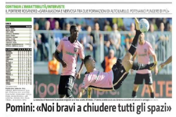 “Una gara motto tattica ed equilibrata quella di ieri contro il Frosinone, giocata alla pari e a viso aperto, anche se forse sono stati i palermitani a tenere di più le redini della partita, pur senza riuscire a portare a casa l’intera posta in patio. Il Palermo ha confermato la granitica solidità the ha contraddistinto quasi tutte le prestazioni sciorinate fin qui. La compagine di Tedino ha tenuto il campo con equilibrio, autorevolezza e personalità, rischiando pochissimo pur denotando le consuete difficoltà nello sviluppo della fase offensiva. Al termine a gara non c’è rammarico nelle parole dei giocatori rosanero, che sono infatti tutti contenti e soddisfatti della propria prestazione. Ai microfoni della mixed-zone nel post gara ha parlato per tutti il portiere Alberto Pomini, chiamato ancora una volta in causa per sostituire il giovane Posavec, non convocato per infortunio: «Abbiamo affrontato quella che sappiamo essere una delle squadre più forti della Serie B di quest’anno. Ovviamente ci eravamo preparati, ma questo non significa che eravamo pronti. Affrontare le partite, infatti, non è mai semplice. Certo ci si prepara, si cerca di studiare una tattica e di giocare le partite in un determinato modo studiando prima l’avversario, ma non è automatico che possano venire bene. Credo che sia stata una partita non bellissima, forse a tratti noiosa, ma spigolosa, nervosa, tra due squadre che diranno la loro fino alla fine. Credo ne sia venuta fuori una gara maschia, anche se con poche occasioni da una parte dall’altra». […]”.