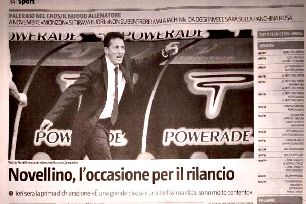 “A novembre ‘Monzon’ si tirava fuori: «Non subentrerei mai a Iachini». Da oggi sarà sulla panchina del Palermo. Ieri sera la prima dichiarazione: «E’ una grande piazza e una bellissima sfida, sono molto contento». In panchina ha costruito le fortune delle squadre che ha allenato con un attacco composto da una punta di peso e una più di qualità, con un regista dai piedi buoni in mezzo al campo e una difesa a zona, alta e in linea”. Questo quanto scrive l’edizione odierna de “Il Giornale di Sicilia” in merito al neo-tecnico rosanero, il settimo in stagione, Walter Novellino, che oggi arriverà in città e proverà sin da subito a trasmettere le proprie idee alla squadra, nella prima seduta di allenamento al Tenente Onorato.