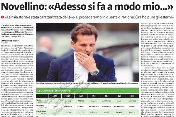 “Sorrisi e diplomazia non abitano più sul viso di Walter Novellino. Tra i solchi del volto ha lasciato il segno la prestazione negativa più che la sconfitta con il Chievo, l’ira non è sfumata, anzi. Il tempo delle carezze è finito. Ne va del suo… nome. «Le mie squadre concedono poco e ripartono – sottolinea l’allenatore rosanero – e il Palermo visto a Verona non ha dimostrato certo questo tipo di gioco. Le mie formazioni vanno in campo per lottare, io sono qui perla salvezza, ma con l’approccio fatto vedere nell’ulti- ma gara non si evita la retrocessione. Cosa è successo? Non me lo spiego. anche perché tutti in allenamento hanno dato il massimo. almeno da quando io sono qui. In ogni caso si torna a giocare come piace a me, la mia storia è stata caratterizzata dal 4-4-2 e procederemo in questa direzione. Cosa è cambiato rispetto a prima? Adesso abbiamo esterni che hanno gamba e corsa, prima non c’erano le condizioni. Non voglio dare aiuti agli avversari. ma al di là della tattica e dei moduli. che in un certo senso possiamo lasciare perdere. conta l’atteggiamento, le chiacchiere stanno a zero. Non sono uno sprovveduto, mi rendo conto che abbiamo fatto un punto in tre partite, ma penso che con un altro tipo di partita, a Verona, avremmo portato serenamente a casa almeno un punto. Con la Lazio dobbiamo provare a ottenere il massimo. Se mi sento a rischio? Dico solo che conta fare risultato, possibilmente vincere, e salvare questa squadra. Zamparini o non Zamparini…». La sensazione è che «Monzon», per una sfida delicatissima come quella con la Lazio, abbia pienamente preso il timone della barca […]”. Questo quanto scrive l’edizione odierna de “Il Giornale di Sicilia” analizzando le parole di Walter Novellino alla vigilia di Palermo-Lazio.