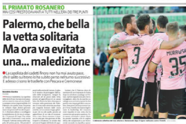 “Prima e maledetta. La capolista della Serie B non ha mai avuto pace, nel suo stare in cima ad una classifica sempre corta e imprevedibile. E il Palermo, che quella vetta l’ha presa in solitaria dopo dodici giornate (mai cosi presto nell’era dei tre punti), è chiamato adesso a sconfiggere la maledizione di chi sta al comando. C’è passato il Carpi, l’ha subita due volte il Frosinone e cosi anche l’Empoli, l’ultima caduta nella trappola del primo posto. Chi prende il trono lo perde alla partita successiva. Questo e il leit-motiv della Serie la schiacciata di sempre, almeno nella sua versione a ventidue squadre, dove oggi sei primo e domani ottavo. Il Palermo l’ha vissuto sulla propria pelle, pur trovandosi in alto con due coinquiline, adesso deve dimostrare di aver imparato la lezione vivendo da solo nel piano più alto della cadetteria. Basta una sconfitta, la prima della stagione, per far crollare la squadra di Tedino dal primo posto ai margini della zona playoff. Adesso arriva una fase ancor più dura a complicare i piani dei rosa. Quel primo posto in totale solitudine che mancava dal 2014, dall’ultima giornata di un campionato trionfale concluso con il record di punti nella scoria del torneo, e adesso il «tesoro» da proteggere dall’assalto delle inseguitrici. Sempre li, attaccate ad un passo dalla vetta, pronte ad approfittare di un passo falso che finora ha fatto chiunque si trovasse nella posizione del Palermo. E i rosa sono attesi da una doppia trappola lontano dalle mura amiche, un’occasione troppo ghiotta per chi sta alle spalle, pronto ad approfittare di un calo di tensione. […]”.
