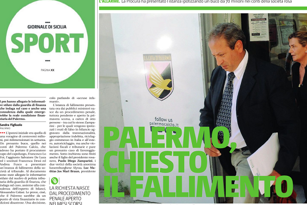 “L’ipotesi iniziale era quella di una voragine di centoventi milioni, poi ridimensionati in settanta. Un presunto buco, quello nei conti del Palermo Calcio, che adesso ha portato il procuratore capo del capoluogo, Francesco Lo Voi, l’aggiunto Salvatore De Luca ed i sostituti Francesca Dessi ed Andrea Fusco a presentare un’istanza di fallimento della società al tribunale. Al documento sono state allegate le informative stilate dal nucleo di polizia tributaria della guardia di finanza, che indaga sul caso, assieme alla consulenza dell’esperto di bilanci, Alessandro Colasi. Le prove, cioè, che il Palermo sarebbe da un punto di vista finanziario in condizioni disastrose. Una decisione, quella di chiedere il fallimento, che era nell’aria da diversi mesi, ma che ora – per i magistrati – sarebbe compiutamente dimostrata dagli atti. L’ultima parola spatterà ovviamente al tribunale fallimentare: il presidente della sezione palermitana, Giovanni D’Antoni, dovrà ora fissare la prima udienza e poi saranno i giudici, anche sulla scorta degli elementi che porterà la società, a stabilire se debba «morire» oppure no.[…]”.