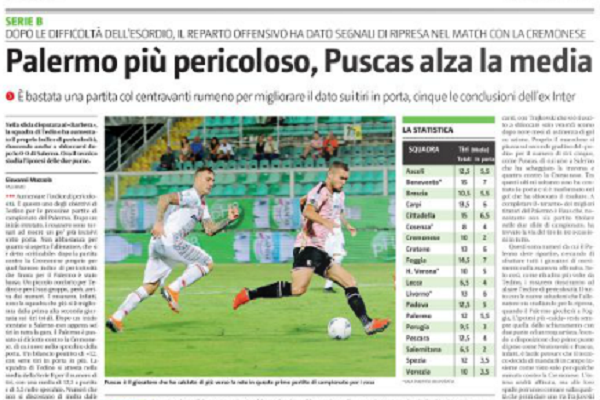 “Aumentare l’indice di pericolosita. E’ questo uno degli obiettivi di Tedino per le prossime partite di campionato del Palermo. Dopo un inizio stentato, i rosanero sono tornati ad essere un po’ incisivi sotto porta. Un piccolo conforto per Tedino e per il suo gruppo, però, arriva dai numeri. I rosanero, infatti, sono la squadra che si è migliorata dalla prima alla seconda giornata sui tiri totali. Dopo un inizio stentato a Salerno con appena sei tiri d in tutta la gara, il Palermo è passato ai diciotto contro la Cremonese di cui nove nello specchio della porta. Un bilancio positivo di +12 con sette tiri in porta in più. La squadra di Tedino si attesta nella media della Serie B peril numero di tiri, con una media di 12.5 a panda e di 5,5 nello specchio. […]. Il dato del Palermo è stato migliorato nella partita contro la Cremonese soprattutto grazie all’apporto del tanto atteso Puscas all’esordio. Il rumeno è il giocatore rosanero che finora ha calciato più volte nell’arco di una partita. In tutto cinque tiri di cui tre nello specchio della porta, nella partita dispu-tata contro i grigiorossi di Mandorlini. Un chiaro segnale di come l’apporto dell’attaccante scuola Inter sia importante per una squadra che nel precampionato ha faticato a trovare la via del gol con gli attaccanti. […]”.