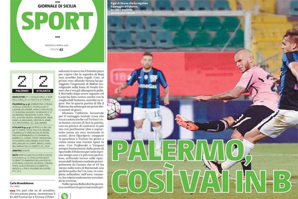 E’ un pareggio che sa di sconfitta quello rimediato ieri sera dal Palermo in casa contro l’Atalanta. A scriverlo è l’odierna edizione de “Il Giornale di Sicilia”, secondo il quale salvarsi è difficile, ma non impossibile. Quello che colpisce però dei rosanero è l’insicurezza e l’incapacità della compagine siciliana di creare un gioco credibile. Al termine della stagione mancano solamente quattro turni, il prossimo sarà in casa del Frosinone, domenica alle 12.30.