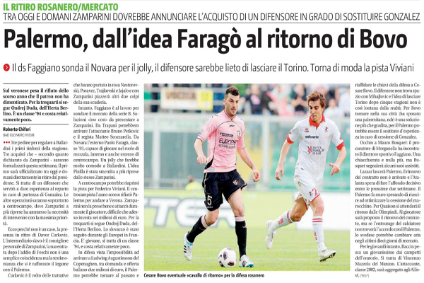 Giornale di Sicilia: “Palermo, dall’idea Faragò al ritorno di Bovo. Il ds Faggiano sonda il Novara per il Jolly, il difensore tornerebbe volentieri. Torna di moda Viviani”
