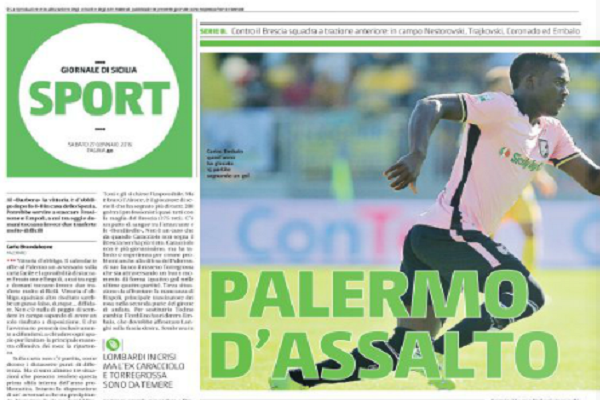 “Vittoria d’obbligo. Il calendario offre al Palermo un avversario sulla carta facile e la possibilità di staccare Frosinone e Empoli, a cui tra oggi e domani toccano invece due trasferte molto difficili. Vittoria d’obligo, qualsiasi altro risultato sarebbe un passo falso, dunque… diffidate. Non c’è nulla di peggio di scendere in campo sapendo di avere un solo risultato a disposizione. E che l’avversario penserà esclusivamente a difendersi, a chiudere ogni spazio per limitare la principale manovra offensiva dei rosa: la ripartenza. Sulla carta non c’è partita, come dicono i diciassette punti di differenza. Ma ci sono almeno tre situazioni che possono rendere questa prima sfida interna dell’anno problematica. Intanto la disperazione di un’avversaria che sta precipitando. Non vince da cinque turni il Brescia (dal 2 dicembre contro la Salernitana), e reduce da due ko di fila e il ritomo in panchina di Boscaglia al posto di Marino durante la pausa non ha portato benefici, almeno per come è andata contro l’Avellino. Farà le barricate il Brescia cercando a volte il contropiede. E contro le barricate del Palermo ha spesso sofferto per mancanza di inventiva e di un giocatore di peso in area. Al Palermo piacciono le squadre come la Salemitana e Ternana, spavalde e un po’ guascone. […]”.