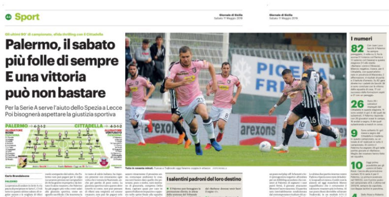L’edizione odierna del “Giornale di Sicilia” si sofferma sull’intreccio tra campo ed extra-campo che sta travolgendo il Palermo. La speranza di andare in Serie A si mischia alla paura di precipitare in Serie C. L’impresa della promozione diretta è difficile, considerando un probabile risultato positivo del Lecce o per un eventuale penalizzazione. Esserci oggi sarà necessario a dire con forza che Palermo non vuole scomparire dal calcio, che non può pagare le colpe di chi ha gestito in proprio e da lontano il calcio rosanero, che Palermo ha già pagato più volte conti salati alla giustizia sportiva. I tifosi e la città sono parte lesa e ancora si aspetta la decisione per le vicende di Frosinone. Palermo ha dato tanto al calcio italiano, la giustizia sportiva non può pensare di rifarsi una verginità col cotone rosanero. Ci vorrebbe un libro intero per raccontare questo sabato dai toni disperati. Non sarà facile contro il Cittadella, squadra intenzionata a centrare l’obiettivo play-off. La partita sarà condizionata dal risultato di Lecce e si annuncia un pomeriggio ad altissima tensione. A prescindere da tutto, i rosanero dovranno vincere, anche per dare un segnale di ripresa in vista dei play-off. Non sarà una partita normale per mille motivi, ognuno ha qualcosa da farsi perdonare, non sapendo se il Palermo giocherà mai i play-off, può essere l’ultima occasione di gloria.