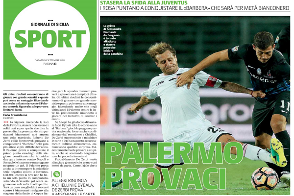 Giornale di Sicilia: “Palermo, provaci! I rosa contro la Juventus provano a conquistare il Barbera che sarà per metà bianconero”
