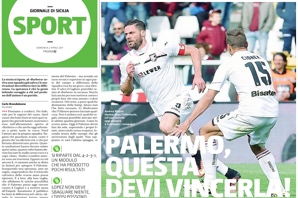 “Proviamo a crederci. Per fede, solo per le ragioni del cuore. Quel cuore che batte forte in tutti quei ragazzi che giovedì hanno sostenuto i rosa nell’allenamento aperto al «Barbera» e che anche oggi urleranno a petto nudo in curva Nord l’amore per la propria squadra. Ragazzi che guardano avanti, come giusto che sia alla loro età, e che per fortuna dimenticano presto. Quante umiliazioni hanno dovuto subire quest’anno, quante volte hanno dovuto lasciare lo stadio senza voce e a capo chino. Undici sconfitte interne sono un’enormità. Eppure eccoli ancora li, ci saranno anche se divisi in fazioni per spingere il Palermo. Inseguendo una speranza, anzi un sogno, augurandosi che il miracolo calcistico dello scorso anno possa ripetersi. É a loro, alla loro voglia, che affidiamo le uniche possibilità che il Palermo possa oggi vincere contro il Cagliari e a mettere ansia all’Empoli. Raramente il pubblico ha fatto la differenza nel calcio, tal- volta le pressioni hanno invece creato disagi alla squadra obbligata a vincere, ma in presenza di un gruppo totalmente incapace di imbastire qualsiasi forma di calcio offensivo non resta che votarsi alla spinta che arriverà dagli spalti, sperando che metta le ali a chi non attrezzato per volare, che infonda coraggio a chi nel profondo dell’anima un pavido. É una storia che si ripete e da tempo ci illudiamo che le motivazioni possano compensare la differenza di valori in campo. Amaro ammetterlo ma il Cagliari, che ha 17 punti in più del Palermo, di un’altra categoria. Seppur matricola ha preso giocatori veri come Padoin, Isla, Borriello, Tachtsidis, ha tenuto Joao Pedro e Farias (che oggi non ci sarà), subisce tanti gol – solo uno in meno del Palermo – ma avendo un tasso tecnico superiore in ogni parte del campo a differenza della squadra rosa ha un gioco, una identità. É salvo il Cagliari, potrebbe venire al “Barbera» in vacanza. Non lo farà anche per non mettersi contro i propri fans che non amano i colori rosanero. Del resto, a parte qualche distrazione della Samp, finora non l’ha fatto nessuno. Ci illudevamo che l’Udinese potesse lasciare qualcosa. Non è andata cosi, qualche regalo semmai potrebbe arrivare nel- le ultime quattro giornate. Come lo scorso anno. Oggi il Palermo dovrà fare da solo, superando i propri li- miti, attaccando senza scoprirsi, facendo tesoro delle energie che gli arriveranno dagli spalti. Non sappiamo se sarà l’ultima spiaggia, se non vincere oggi vuol dire lasciare ogni speranza di salvezza. Sappiamo per certo che non battere un’avversaria già salva che in trasferta ha fatto meno punti dei rosa (appena otto) sarebbe l’ulteriore conferma che questa squadra non merita di restare in Serie A. […]”. Questo quanto riportato da “Il Giornale di Sicilia”.