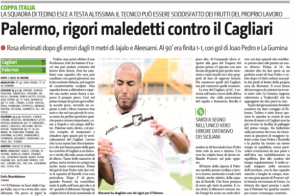 “Il Palermo va fuori dalla Coppa Italia, ma ci va a testa alta, anzi altissima. Ha perso ai rigori la squadra rosanero contro il Cagliari, formazione di categoria superiore che per un tempo ha dominato. Ha perso ai rigori per gli errori iniziali di Jajalo e Aleesami che paradossalmente erano stati forse i migliori tra i rosa durante i 120 minuti giocati all’Olimpico di Torino. 120 minuti intensi, che hanno premiato il lavoro di Tedino sul piano atletico e della mentalità. Non è stato un grande Palermo ma la squadra rosa non ha mai mollato, ha reagito dopo il vantaggio alla fine del primo tempo di Joao Pedro, ha pareggiato con La Gumina all’inizio della ripresa e poi ha tenuto botta ai sardi fino al temine dei supplementari. Alla fine i rosa si sono guadagnati gli applausi del gruppetto di fans che li ha sostenuti anche sul neutro di Torino (il Cagliari non ha ancora pronto il proprio campo) e che ha coltivato il sogno di passare il terzo turno di Coppa Italia. Tedino non potrà sfidare il suo Pordenone (che ha battuto il Lecce) ma può andare contento del lavoro fatto finora. Non ha cambiato una squadra che non può cambiare con questi giocatori, ma le ha restituito fiducia, nel rispetto di caratteristiche scolpite. Una squadra brava a difendersi e ripartire ma molto meno brava a imporre il proprio gioco. […]”.