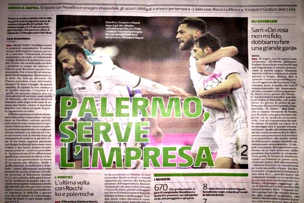 “Si riparte con Novellino e una gara impossibile, gli azzurri obbligati a vincere per tornare a -3 dalla Juve. Riecco la difesa a 4, Vazquez e Quaison dietro Gila. Il nuovo tecnico cambia solo in difesa, per il resto la squadra non si scosterà da quella di Iachini. Nel centrocampo a 3 c’è ancora posto per Chochev. Per provare a fare il miracolo c’è bisogno pure dei tifosi”. Questo scrive l’edizione odierna de “Il Giornale di Sicilia” in merito al match di questa sera tra Palermo e Napoli. Il quotidiano poi prosegue: “Alfredo Walter Novellino contro la proprietà commutativa- Il settimo tecnico della stagione rosanero proverà a smentire l’elementare formula matematica secondo cui cambiando l’ordine dei fattori il risultato non cambia. Ovvero che modificando modulo e posizioni in campo dei rosanero il Palermo può diventare una buona squadra. E se ci riuscirà avvalorando le tesi di Zamparini, dimostrerà ipso facto che tutti gli allenatori che l’hanno preceduto erano dei ronzini incapaci di tirare il meglio da questa squadra. L’impresa è di quelle che possono segnare una carriera già ricca di successi come quella di «Monzon», che a 63 anni ritrova la massima serie dopo sette anni di assenza, ma l’inizio contro il micidiale Napoli e con i tifosi sul piede di guerra appare tutto in salita […]”.