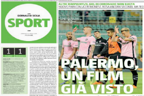 L’edizione odierna de “Il Giornale di Sicilia” ha analizzato il pari di ieri contro la Cremonese. Ecco quanto si legge: “Lo Spezia tiene il Palermo con un piede in Serie A, ma la panchina di Tedino torna a traballare. L’impegno di martedi a Cittadella rende difficile un cambio di tecnico in poche ore, tuttavia sembra che già ieri sera Zamparini abbia ripreso in considerazione le idee Stellone e Reja. A distanza di sette giorni i rosa hanno sciupato con le stesse modalità una grande occasione per staccarsi al secondo posto. Con Pescara e Cremonese doveva essere una doppietta da sei punti e ne sono arrivati solo due. Con lo stesso punteggio e in entrambi i casi la squadra di Tedino è stata rimontata. E anche ieri come era accaduto contro gli adriatici ha praticato a lungo un calcio arruffone e con poche idee, affidandosi ancora una volta principalmente alle iniziative di Coronado, che al 16′ della ripresa aveva sbloccato il risultato con un tap-in di testa sulla corta respinta centrale di Ujkani sulla battuta forte da destra di Rispoli. […]”.