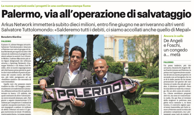L’edizione odierna del “Giornale di Sicilia” approfondisce le dichiarazioni trapelate dalla conferenza stampa di presentazione della nuova proprietà del Palermo. I Tuttolomondo hanno presentato il progetto che dovrà salvare la società: «Il 3 maggio, contestualmente al trasferimento azionario, abbiamo sottoscritto il capitale e versato in banca 1,25 milioni, dei quali contiamo di avere l’attestazione entro venerdì (domani,ndr). Nei giorni a seguire immetteremo 3,75 milioni per completare i 5 milioni di capitale, ma questo non basta. Ci siamo impegnati a saldare 4,4 milioni di debiti tributari ed entro il 3 giugno metteremo in totale 10 milioni, con le nostre forze». Entro il 24 giugno dovrà essere completata la documentazione necessaria all’iscrizione del campionato (comprensiva dei pagamenti degli stipendi di marzo, aprile e maggio) ed entro il 30 di giugno vanno saldati i 20 milioni di Mepal: «Ci siamo accollati il debito, più facile di così…Massimo rispetto per York Capital, ognuno fa la propria parte. Noi abbiamo lavorato nel massimo riserbo. Non abbiamo bussato a nessuna porta. Molte persone, anzi, hanno provato ad entrare. Se il club va in A, in dieci bussano alla nostra porta. Finora hanno bussato in due-tre». L’operazione complessiva prevede un investimento di 30 milioni per saldare tutti i debiti del Palermo: «Dobbiamo metterci la faccia, oltre che il portafogli. C’è gente che aspetta soldi da qualche anno. Noi dobbiamo portare il Palermo dalla terapia intensiva alla corsia, che passa dalla chiusura del campionato per iscriverci al prossimo. De Angeli? Se il Palermo ultimamente è andato male non è per volontà sua. È una stimata professionista che da oltre 40 anni vive di calcio, non è soltanto il referente di una proprietà. Ci risulta in maniera irrevocabile che sia stimata anche in Federazione. Noi ribadiamo che è e resta il nostro direttore amministrativo». Un ricordo al padre Antonino: «Questo è un atto alla sua memoria, conosco la Sicilia dagli anni ’60 perché lo accompagnavo spesso ad Agrigento». Anche il fratello Walter lo ricorda: «Era un siciliano autentico. Noi tutti proseguiamo sulla sua linea di indirizzo, soprattutto etica, della quale ci facciamo vanto».