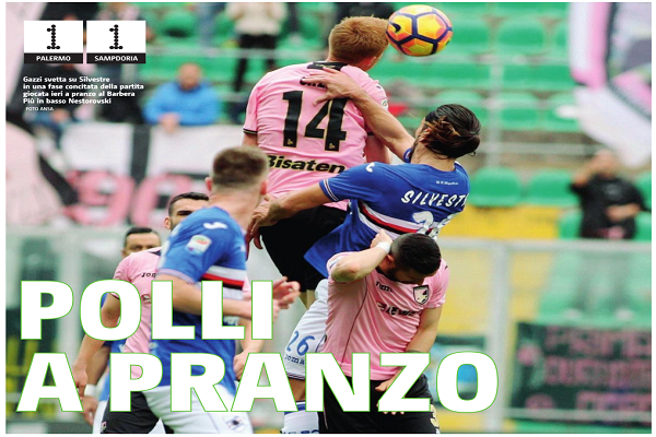 “Polli a pranzo” è questo il titolo con cui l’edizione odierna de “Il Giornale di Sicilia” apre la sua pagina sportiva. Il quotidiano locale poi continua: “Palemo, così fa più male. Nella gara delle 12.30 la Samp beffa ancora i rosanero: dopo il pareggio conquistato in extremis all’andata, i blucerchiati acciuffano l’1-1 al 90′, su una nuova dormita difensiva. Sciupata l’occasione di salire a -5 dall’Empoli”.